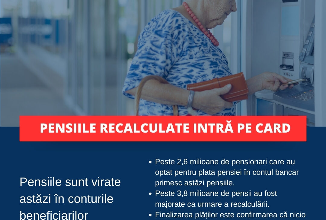 Ministerul Muncii a anunțat joi că pensionarii care au optat pentru plata pensiei prin cont bancar au primit astăzi pensiile recalculate. Potrivit ministrului Muncii și Solidarității Sociale, Simona Bucura-Oprescu, aproximativ 82,5% dintre cele 4,6 milioane de pensii din sistemul public au înregistrat o creștere în urma recalculării.