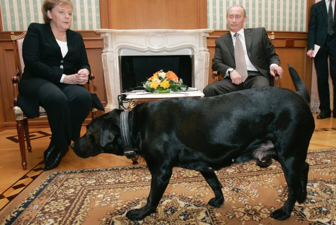 Președintele rus Vladimir Putin (dreapta) și cancelarul federal german Angela Merkel (stânga) discută în timp ce câinele lui Putin, Koni, își face o apariție neobișnuită în timpul întâlnirii lor de lucru de la reședința Bocharov Ruchei, din stațiunea Soci de la Marea Neagră, pe 21 ianuarie 2007.