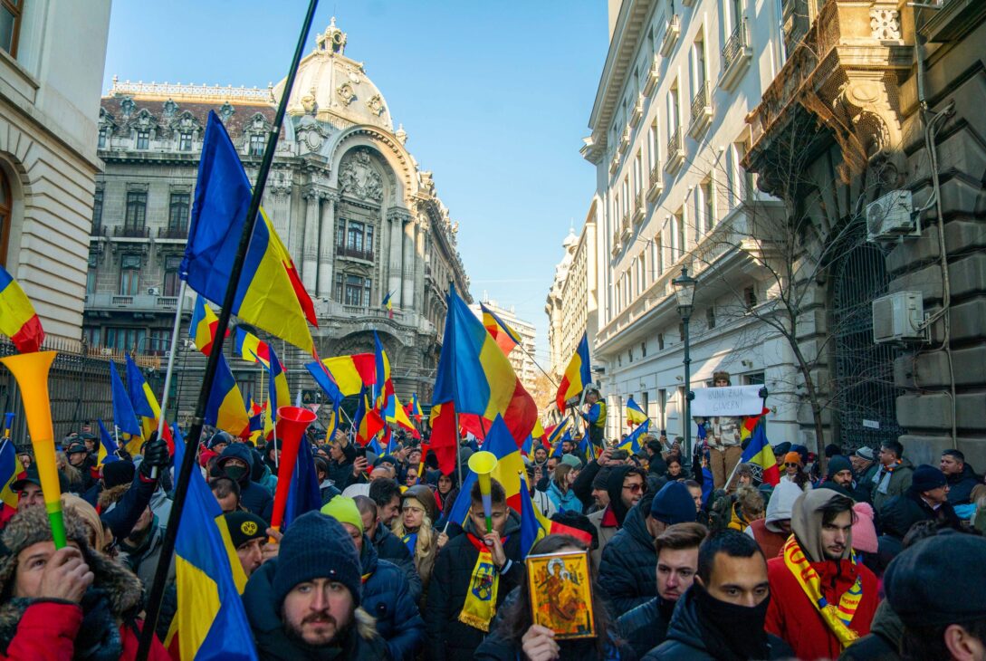 Mai multi simpatizanti ai partidului AUR si ai lui Călin Georgescu protestează în fața prefecturii municipiului București și a prefecturii județului Ilfov. Bucuresti, sambata, 18 ianuarie 2025. Sursa foto: Inquam Photos / Tudor Pana