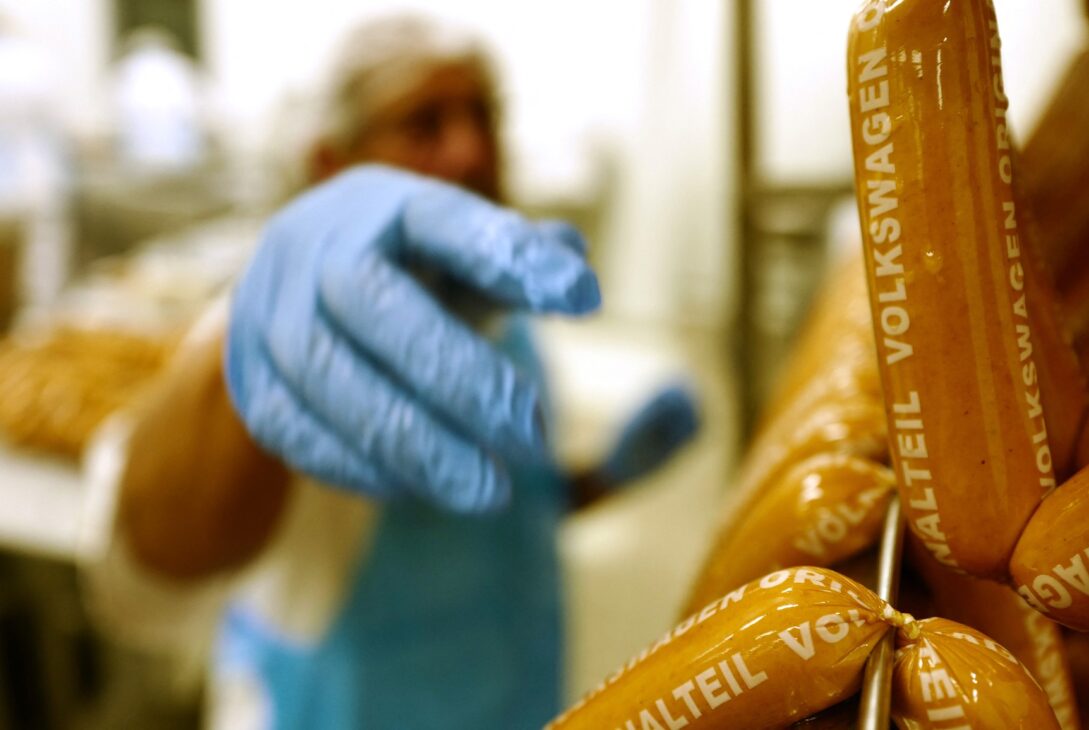 Cârnații currywurst produși la fabrica gigantului auto german Volkswagen, din Wolfsburg, Germania, 21 aprilie 2016.