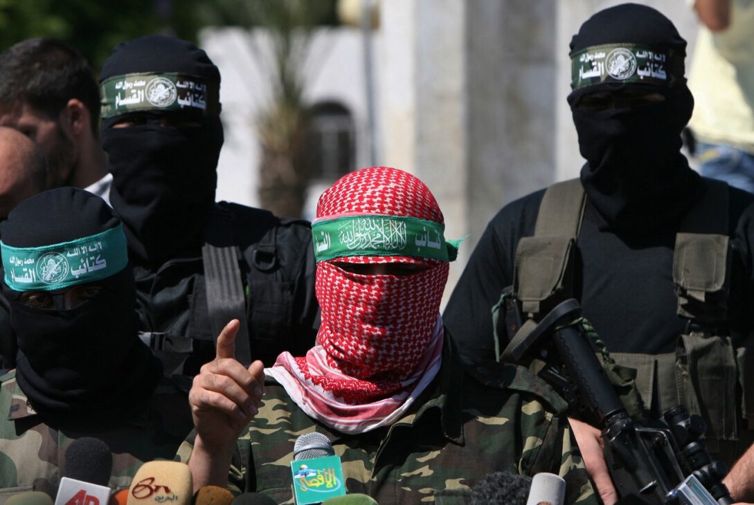 Abu Obaida (centru), purtătorul de cuvânt al Brigăzilor Ezzedin Al-Qassam, ramura armată a mişcării palestiniene Hamas, în timpul unor declarații acordate presei, în orașul Gaza. Credit foto: Mahmud Hams / AFP / Profimedia